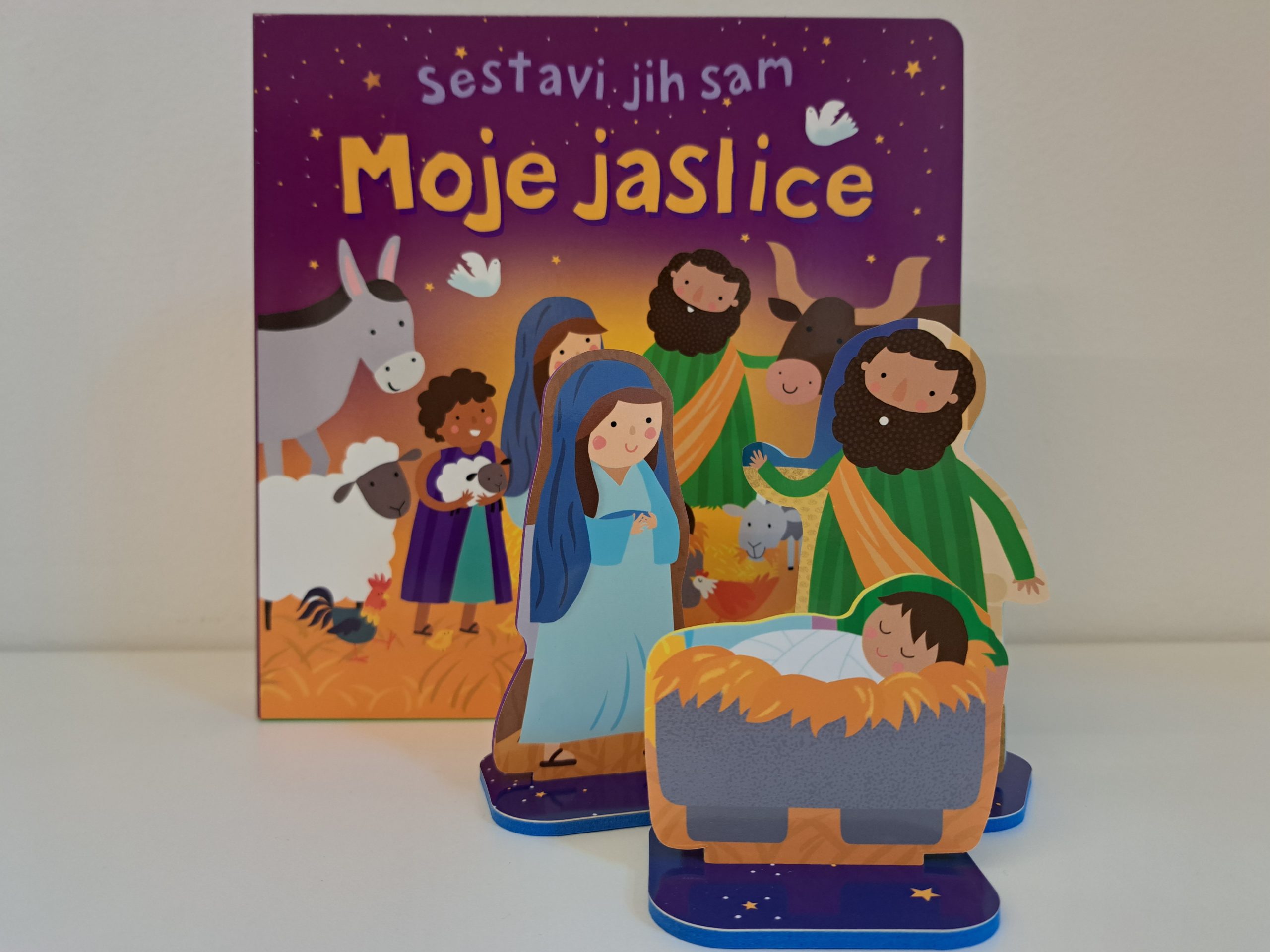 Ob branju zgodbe o Jezusovem rojstvu vas bo na vsaki strani pričakala kartonska figurica, ki jo lahko iztisnete in si z njo sami sestavite svoje jaslice.
