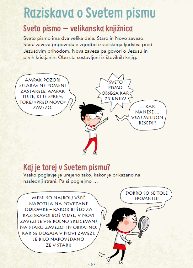 V pričujoči knjigi se bomo skozi Sveto pismo sprehodili s Tomažem in Sofijo, ki bosta pomagala, da se bodo mladi laže znašli v njem. Knjiga je bogato ilustrirana in zaobjema tako Novo kot Staro zavezo. Kratek strip na začetku vsakega poglavja je kratka popestritev sicer zahtevne tematike. Prav tako pa glavna junaka knjige, Tomaž in Sofija, pojasnjujeta zapletene besede na razumljiv. Knjiga je zastavljena kot pravcata raziskava. Dvojne strani z dokumentarno vsebino pa razlagajo o življenju v času nastanka Svetega pisma.