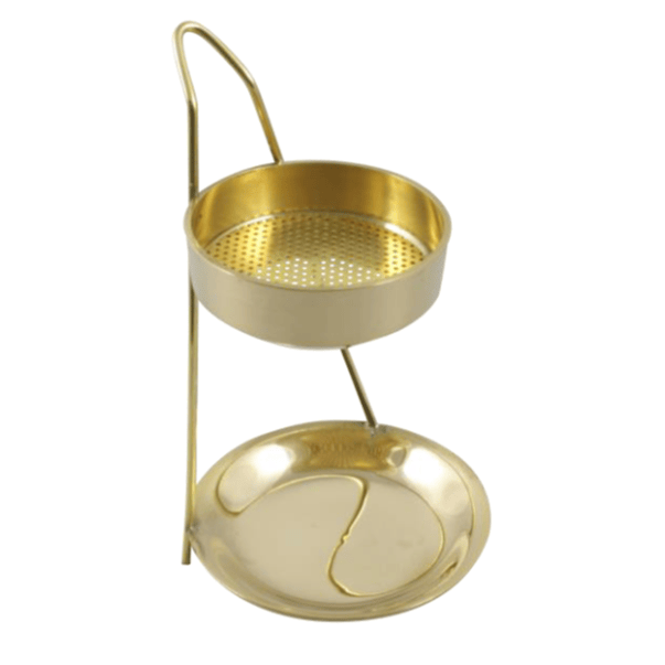 Kadilnica v zlati barvi, s spodnjim pladnjem za čajno svečko in zgornjim za kadilo.