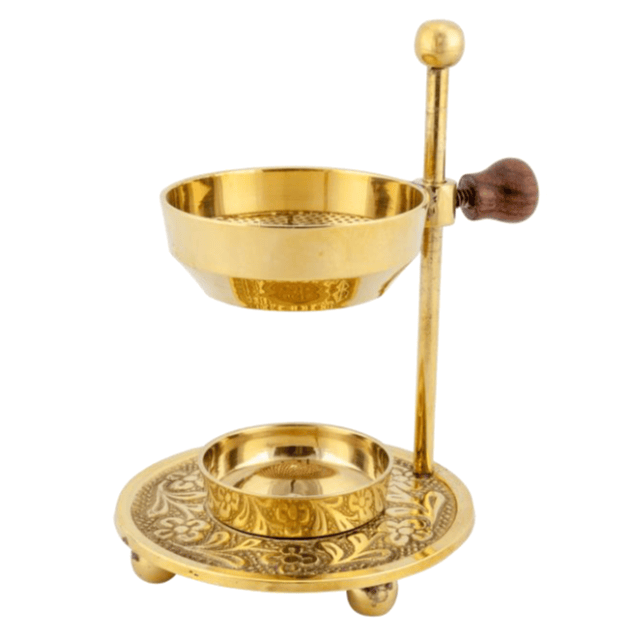 Kadilnica v zlati barvi, z okrašenim spodnjim pladnjem za čajno svečko in prilagodljivim zgornjim pladnjem za kadilo.