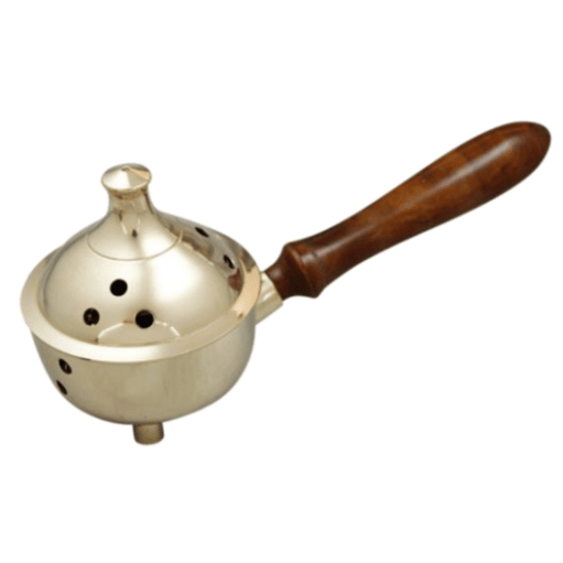 Kadilnica z ročem v zlati barvi. Izdelana iz medenine. Na pokrovu so luknje, skozi katere se nežno dviguje dim.