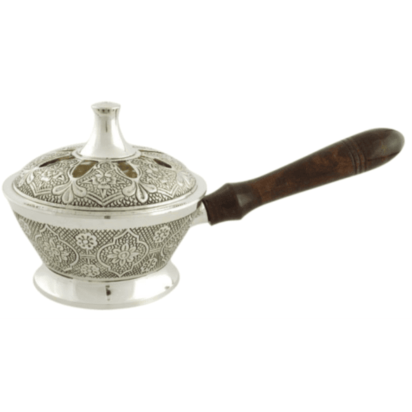 Kadilnica z ročem v srebrni barvi in okrašenim pokrovom. Narejena iz medenine. Na pokrovu so luknje, skozi katere se nežno dviguje dim.