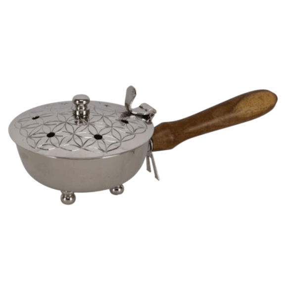 Kadilnica z ročem v srebrni barvi z okrašenim pokrovom. Izdelana iz medenine. Na pokrovu so luknje, skozi katere se nežno dviguje dim.