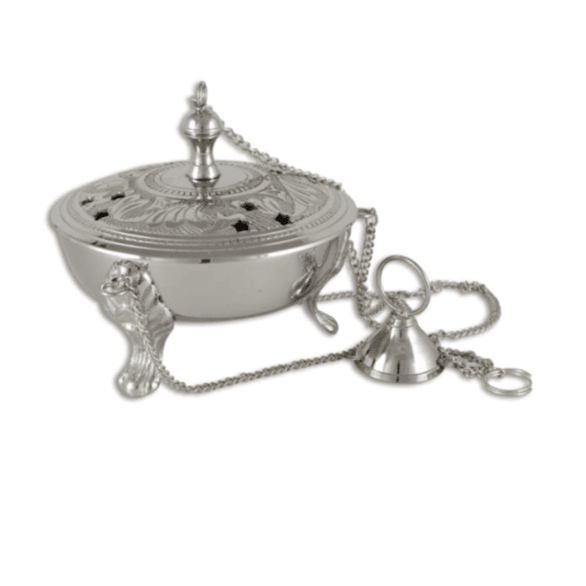 Srebrna kadilnica z verigo, ki stoji na treh okrašenih nogah. Na pokrovu so luknje, skozi katere se nežno dviguje dim.