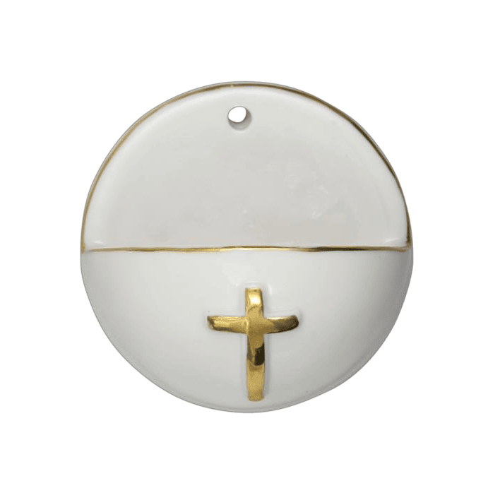 Kropilnik s podobo zlatega križa v velikosti 7 cm. Kropilnik je narejen iz porcelana.