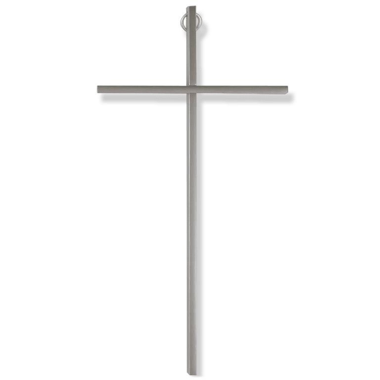 Stenski kovinski križ brez korpusa v srebrni barvi. Velik je 20 cm.