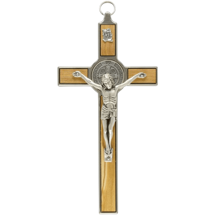 Stenski križ sv. Benedikta v velikosti 20 cm. Križ je narejen iz lesa in kovine.