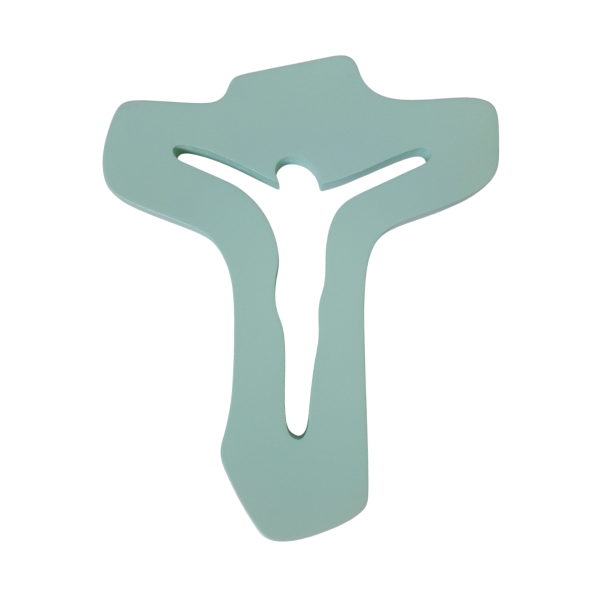 Lesen stenski križ v obliki tau z izrezanim korpusom v zeleni barvi. Križ je visok 24 cm.