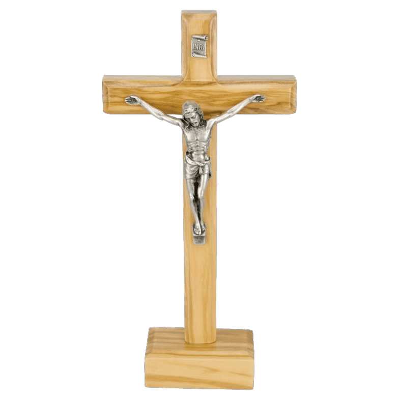 Stoječi križ s kovinskim korpusom. Križ je iz oljčnega lesa in je visok 18 cm.