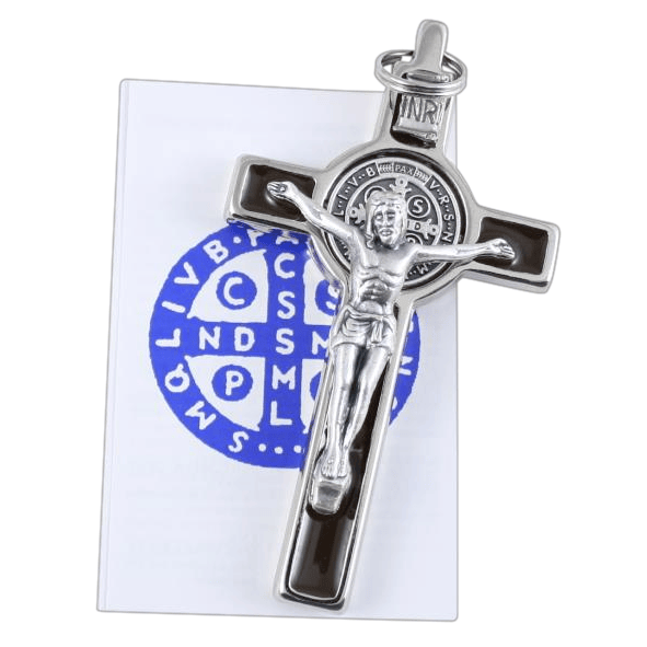 Manjši kovinski križ sv. Benedikta v škatlici. Velik je 8 cm.