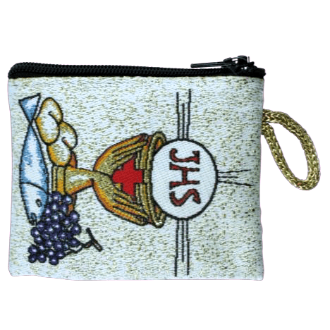 Etui za rožni venec s podobo svete evharistije. V velikosti 8,5 x 7 cm.