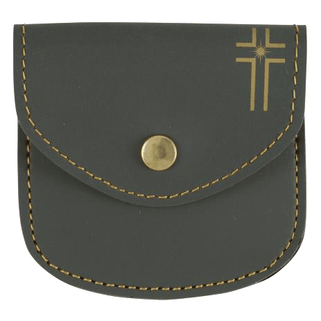 Temno siv usnjen etui za rožni venec v velikosti 8 x 8 cm.