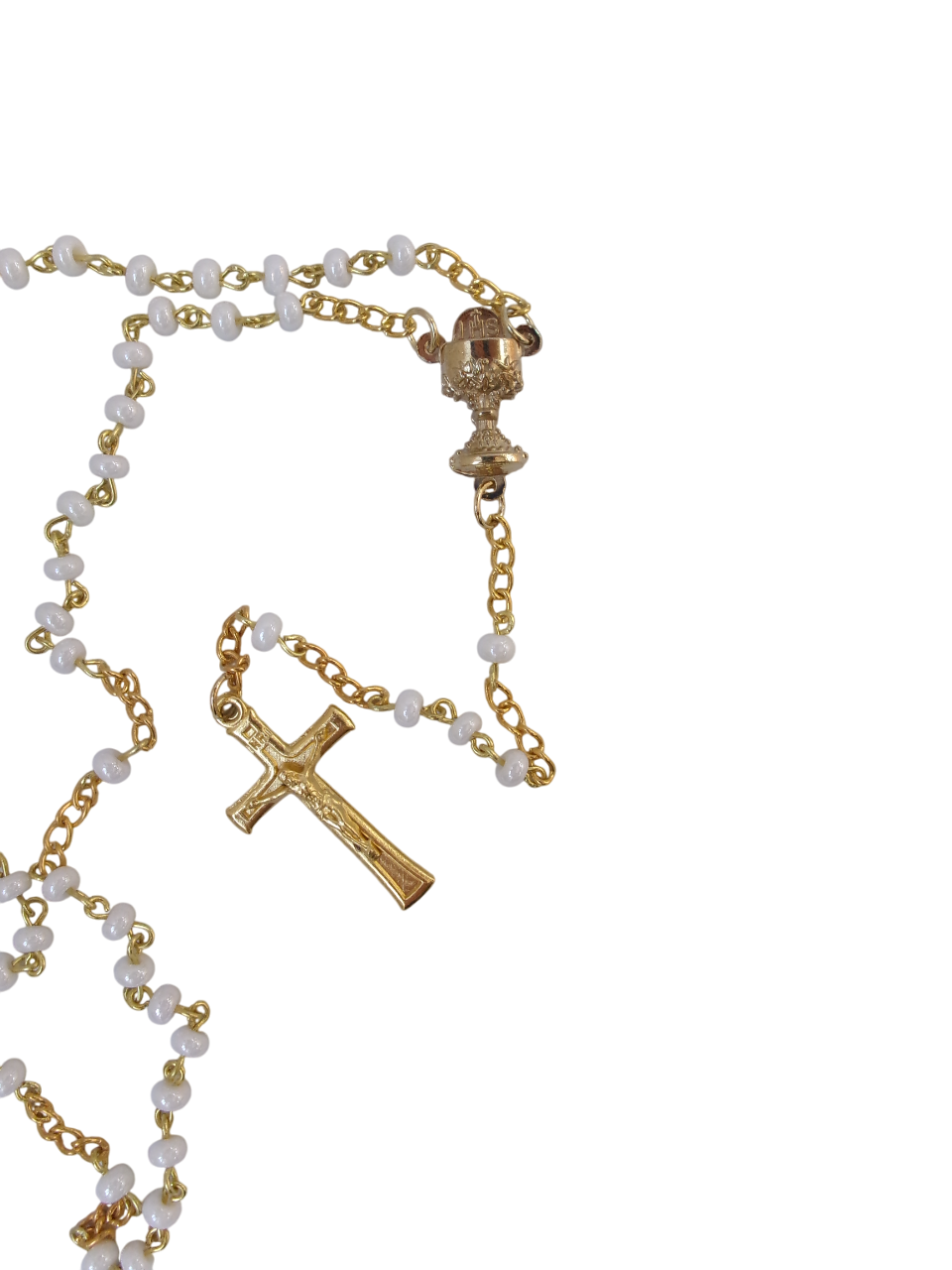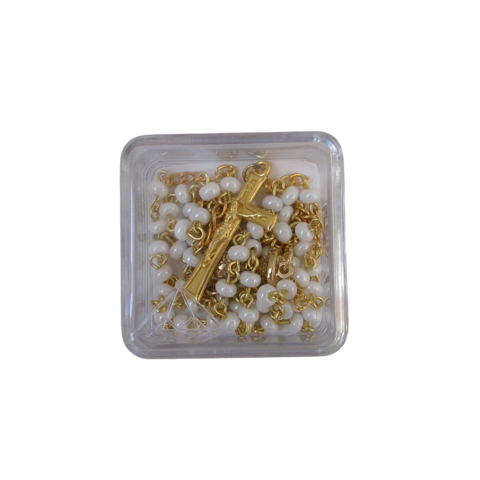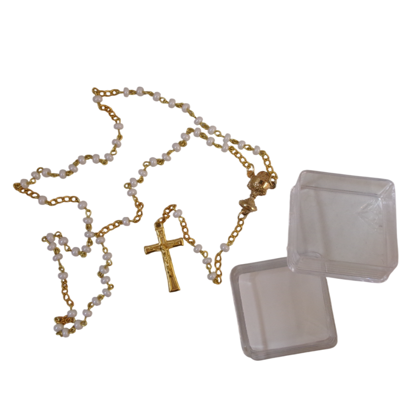 Bel rožni venec z drobnimi jagodami in obeskom v obliki keliha. Rožni venec je shranjen v prozorni škatlici.