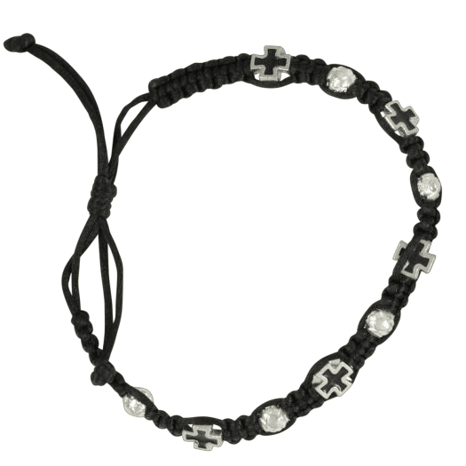 Črna pletena zapestnica z kovinskimi jagodami v obliki kroglic in križev, primerna za molitev desetke. Premer zapestnice je nastavljiv med 6 in 9 cm.