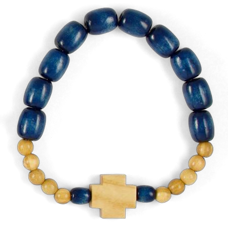Lesena zapestnica z desetimi večjimi modrimi jagodami in križcem. Zapestnica ima premer 6 cm.