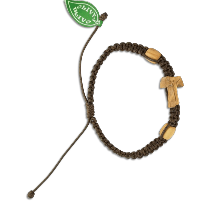 Pletena rjava zapestnica z lesenim tau križem s korpusom iz oljčnega lesa.